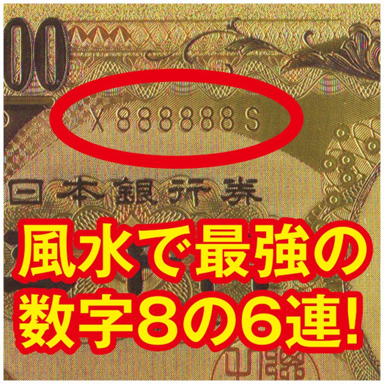 「風水・黄金の五千円札」は、実在する8の6連番号のお札から型取りし、豪華金箔仕上げを施した吉祥の会オリジナル作品です。